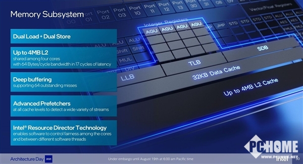 内存部分,使用了双载入、双存储单元的配置,二级缓存增大至4MB,以及深度缓冲、高级预取器,支持Intel Resource Director资源重定向技术,可以让软件在不同核心、不同软件线程之间实现精准的控制。