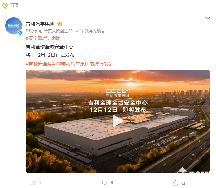 2025年12月12日,吉利汽车集团发布微博宣布,吉利全球全域安全中心将于今日正式发布。