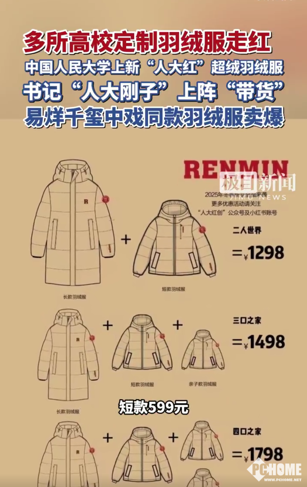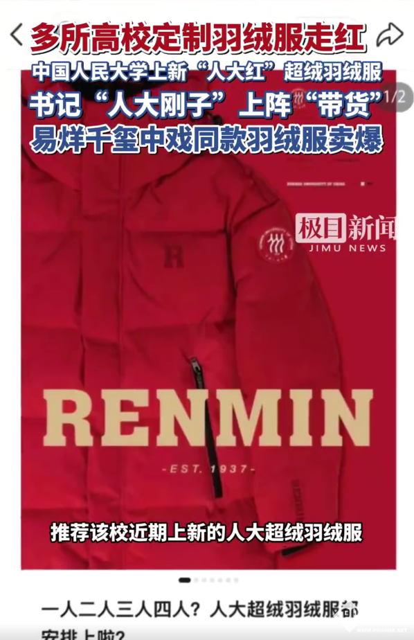 据了解,11日,极目新闻记者联系上销售该羽绒服的人大红创中心,一名工作人员回复称,这几款羽绒服为今年新品,首次推出“人大红”配色,近两日上线后销量可观,目前已有款式出现断码,“各款都比较受欢迎,学生、校友及教职工都有选购,还有不少校友购买家庭套餐”。