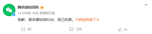 对此,腾讯微信团队于17:09通过官微发文:"抱歉,服务器轻微抖动,现已恢复",目前,未提具体技术原因或补偿方案。