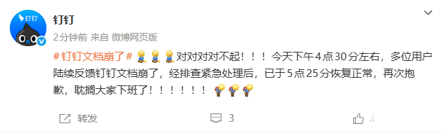 对此,钉钉发布微博表示:今天下午4点30分左右,多位用户陆续反馈钉钉文档崩了,经排查紧急处理后,已于5点25分恢复正常,再次抱歉,耽搁大家下班了。