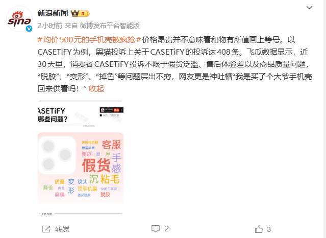 2025年12月12日消息,据新浪微博报道,CASETiFY均价500元的手机壳遭到用户疯抢。