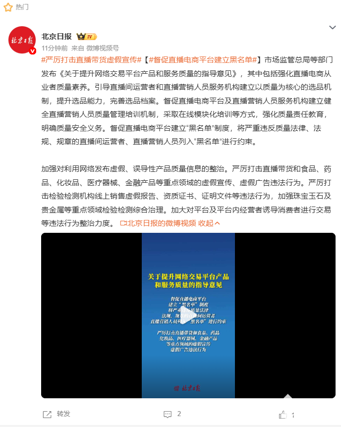 2025年12月12日消息,据北京日报报道,市场监管总局等部门发布《关于提升网络交易平台产品和服务质量的指导意见》,其中包括强化直播电商从业者质量素养。