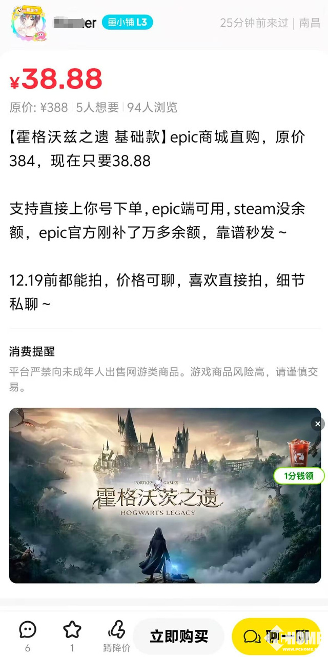 据了解,《霍格沃茨之遗》目前在Epic游戏商城限时免费领取,原价384元,活动截止至2025年12月19日,而据截图显示,该二手平台以38.88元等低价转卖该游戏,声称“代领”或“账号共享”,实则利用信息差牟利,该平台卖家强调“原价384元现仅38.88元”,刻意忽略免费活动,甚至捆绑手游《死亡细胞》销售,实际Epic商城同期也赠送该捆绑游戏。