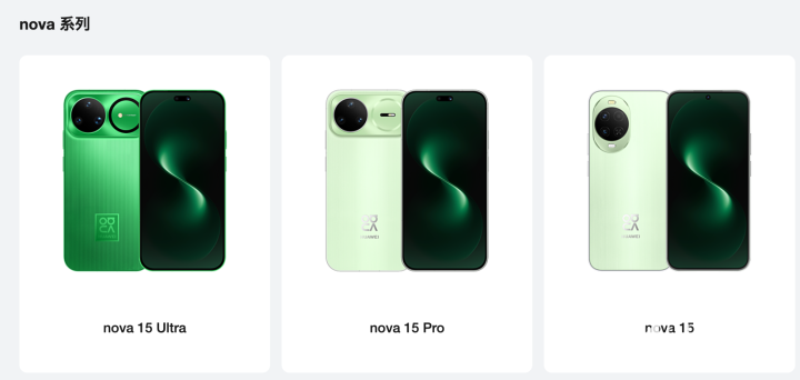 据了解,华为nova 15系列手机包含nova 15、nova 15 Pro、nova 15 Ultra三款机型。其中nova 15采用与上代相同的外观,正面采用单挖孔屏幕,提供12+256GB、12+512GB两个版本,拥有带感绿、好搭紫、零度白、幻夜黑四款配色。