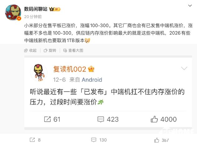 2025年12月15日,知名数码博主“数码闲聊站”发文称,小米部分在售平板已涨价,涨幅100元-300元,其它厂商也会有已发售中端机涨价,涨幅差不多也是100元-300元。