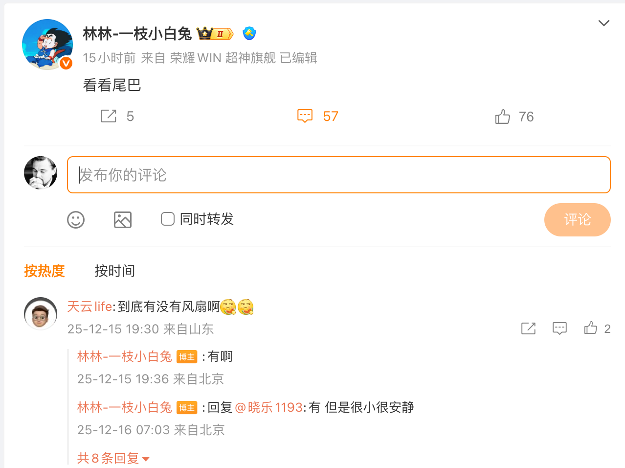 值得注意的是,荣耀中国区智慧生活业务部部长林林在社交媒体平台,晒出了WIN系列新机的小尾巴“荣耀 WIN 超神旗舰”。有网友询问WIN系列新机有无风扇,林林回应称“有啊。”由此来看,荣耀WIN系列手机或将拥有强劲的性能释放。