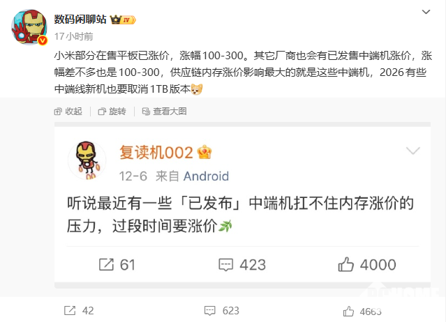 值得注意的是,小米总裁卢伟冰多次表示,当前存储成本上涨远超预期,且为长周期现象,主要受AI驱动的HBM需求激增影响,而非传统手机行业波动。此次小米平板的突然涨价,可能是内存与存储芯片价格持续飙升所导致。