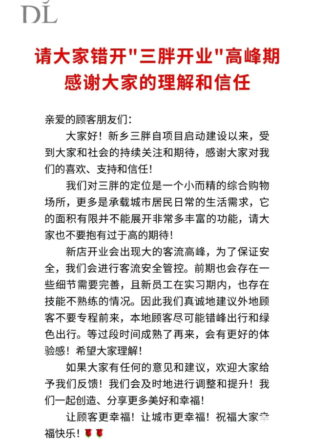据了解,胖东来新乡三胖店即将于近期开业,新乡三胖店定位为“小而精”的社区日常购物场所,主要服务本地居民生活需求,但面积和功能有限,由于新店开业会出现大的客流高峰,为保证安全,官方会进行客流安全管控,并且建议外地顾客不要专程前来,本地顾客尽量错峰或绿色出行,待运营成熟后再到访。