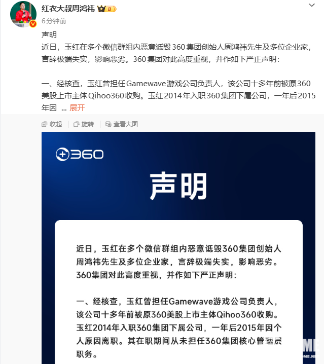 2025年12月16日消息,近日,多家媒体报道,网传前360高级副总裁、三点钟社群核心发起人玉红,在其朋友圈及多个群组中表示,“我帮周鸿祎做假账就至少几十亿的,我都有数据。我会全网公布,他的游戏全部财务造假。”