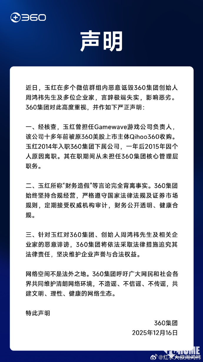 针对此事,360集团创始人、董事长周鸿祎发文予以否认,他回应称,“近日,玉红在多个微信群组内恶意诋毁360集团创始人周鸿祎先生及多位企业家,言辞极端失实,影响恶劣。玉红在职期间从未担任360集团核心管理层职务。玉红所称“财务造假”等言论完全背离事实。”