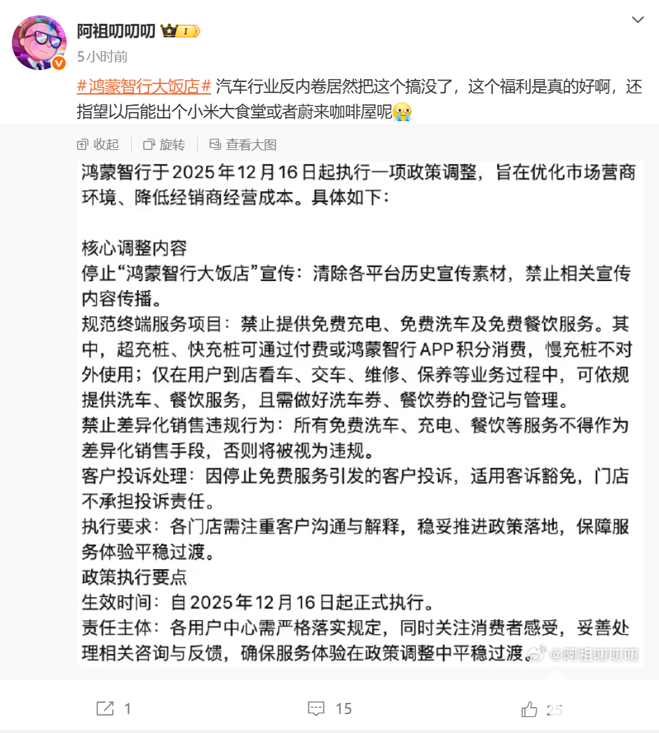 12月16日,汽车博主“阿祖叨叨叨”今日放出了一份鸿蒙智行政策调整通告。此次调整旨在优化市场营商环境、降低经销商经营成本。通知明确要求各用户中心停止“鸿蒙智行大饭店”相关宣传及历史素材清除,并全面禁止提供免费餐饮、充电及洗车服务,标志着这一曾引发广泛关注的特色服务模式正式落幕。