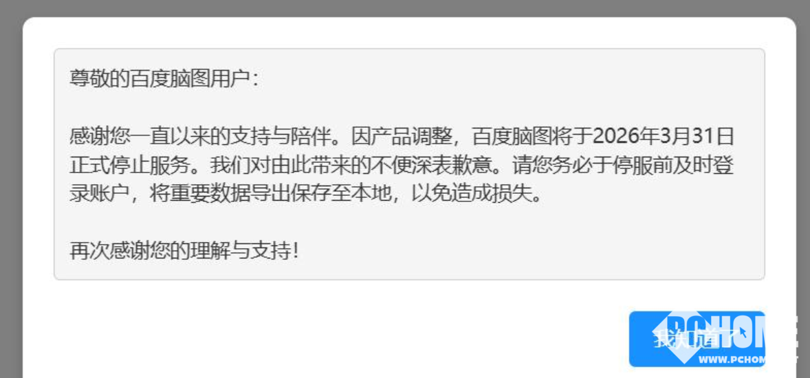 12月16日,百度脑图官方发布公告,宣布因产品调整,将于2026年3月31日正式停止服务,引发大批用户关注。官方在公告中致歉,并着重提醒用户务必在停服前登录账户,将重要数据导出保存至本地,避免造成损失。
