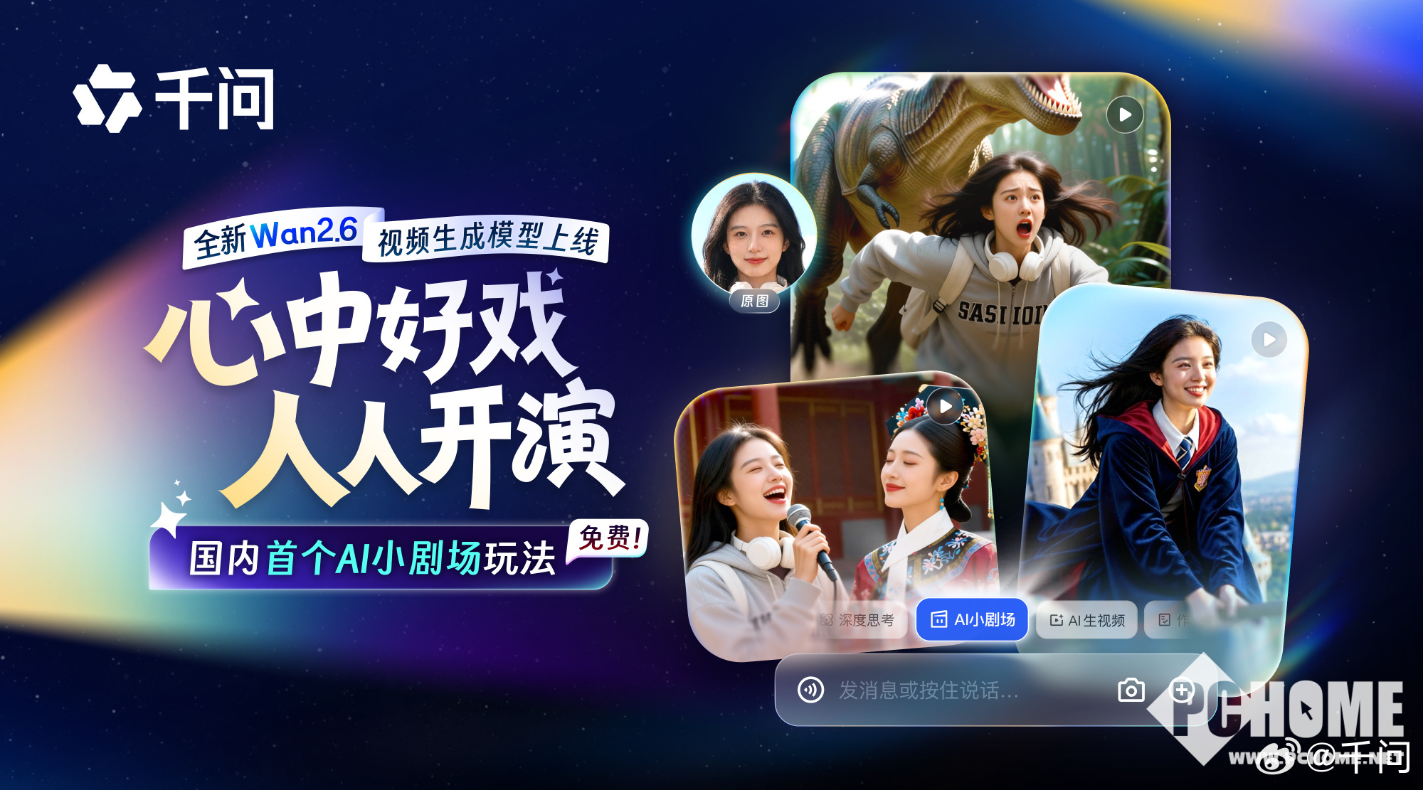 同时,千问推出了国内首个AI小剧场玩法,用户可上传照片或选择虚拟角色,复刻其外貌和音色作为视频主角,通过文字指令调度角色动作、环境光影以及分镜节奏,全面满足个性化剧本需求。