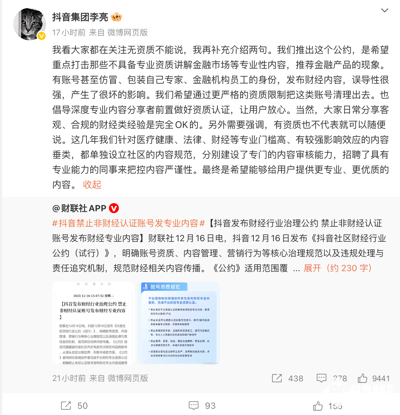 对此,抖音集团副总裁李亮在社交媒体平台表示,抖音推出《财经行业公约(试行)》,是希望重点打击那些不具备专业资质讲解金融市场等专业性内容,推荐金融产品的现象。“大家日常分享客观、合规的财经类经验是完全OK的。”