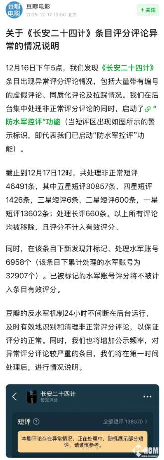 2025年12月17日消息,豆瓣针对《长安二十四计》评分异常发布公告,确认清理超4.6万条非正常评论并标记3.3万个水军账号。