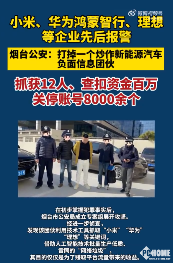 据了解,今年7月份以来,小米公司、华为鸿蒙智行、理想汽车等企业先后报警称:某平台集中涌现大量针对其汽车品牌的负面文章,并且这些内容呈现出高度的组织化特征,经过警方调查,疑似“网络水军”有预谋地进行炒作引流并牟利,在初步掌握犯罪事实后,烟台市公安局成立专案组展开攻坚,发现该团伙利用技术工具抓取“小米”“华为”“理想”等关键词,借助人工智能技术批量生产低质、雷同的“网络垃圾”,其目的仅仅是为了赚取平台流量带来的收益。