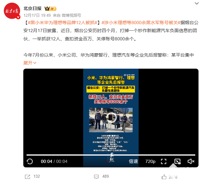 2025年12月18日,据北京日报昨日报道,黑小米、华为、理想等品牌12人被抓,涉小米、理想等8000余黑水军账号被关。