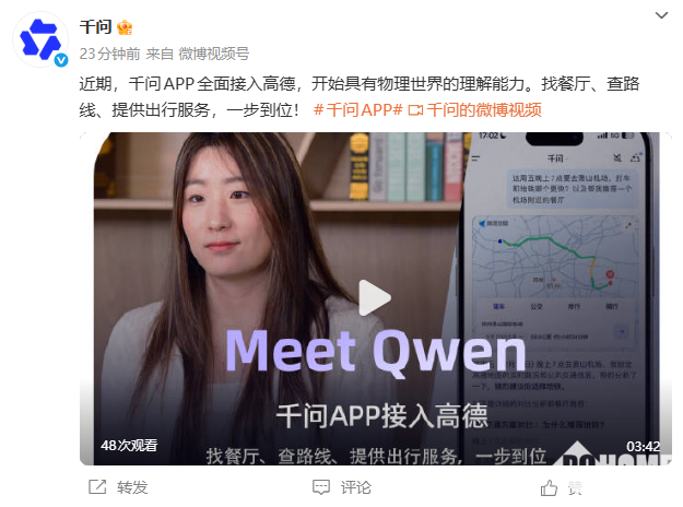 2025年12月18日,千问官方微博宣布,千问APP开始接入第一个阿里生态场景-高德,开始具有物理世界的理解能力。