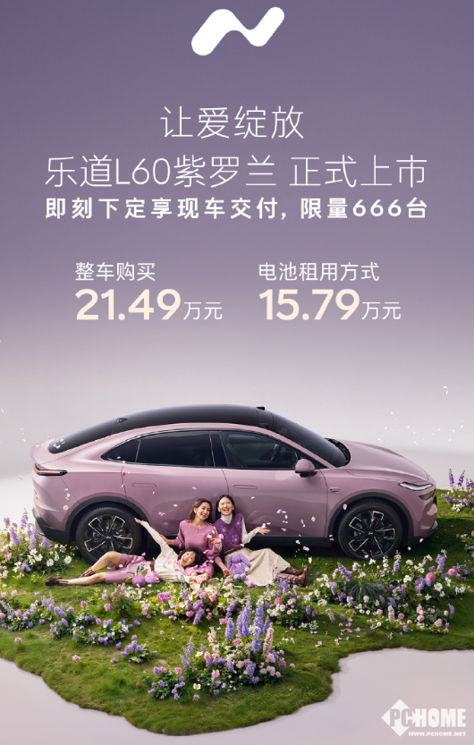 据了解,乐道L60紫罗兰限定版以冬日紫罗兰为设计灵感,限量666台同步开启交付,整车购买价为21.49万元,电池租用方案15.79万元,现车可享购置税全免及至高4.1万元综合礼遇。