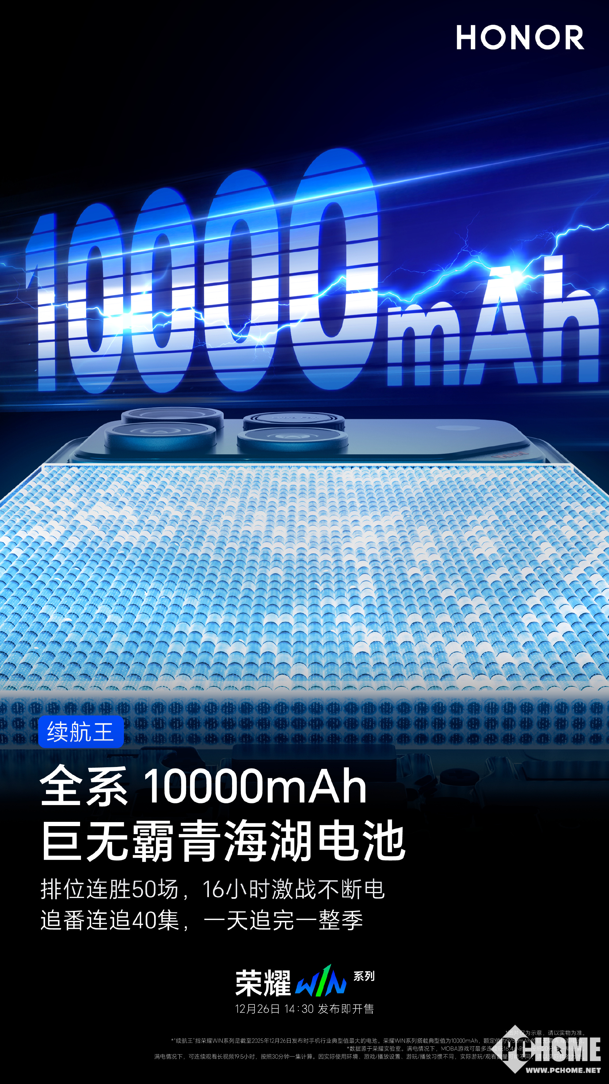 2025年12月22日,荣耀手机官微发布消息称,荣耀WIN全系搭载10000mAh电池,堪称游戏党的“物理外挂”。