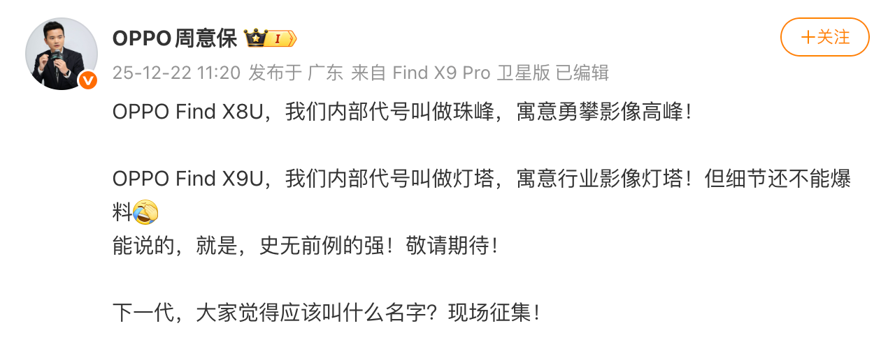 2025年12月22日,OPPO Find系列产品负责人周意保爆料称,OPPO Find X9 Ultra内部代号叫做“灯塔”,寓意行业影像灯塔。