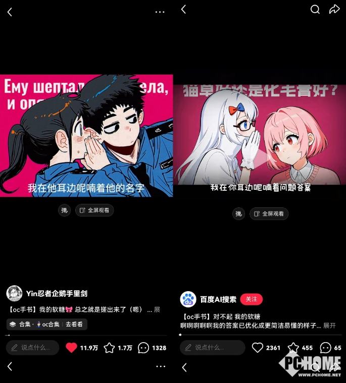 “Yin忍者企鹅手里剑”晒出的图片显示,其此前创造了一系列粉底风格的漫画。随后百度AI搜索官微以此为标准,创作了类似的漫画,甚至底下的字幕都十分类似。对此,“Yin忍者企鹅手里剑”表示,“两个女生但是打bg的tag,这ai真的没谁了我服了”。