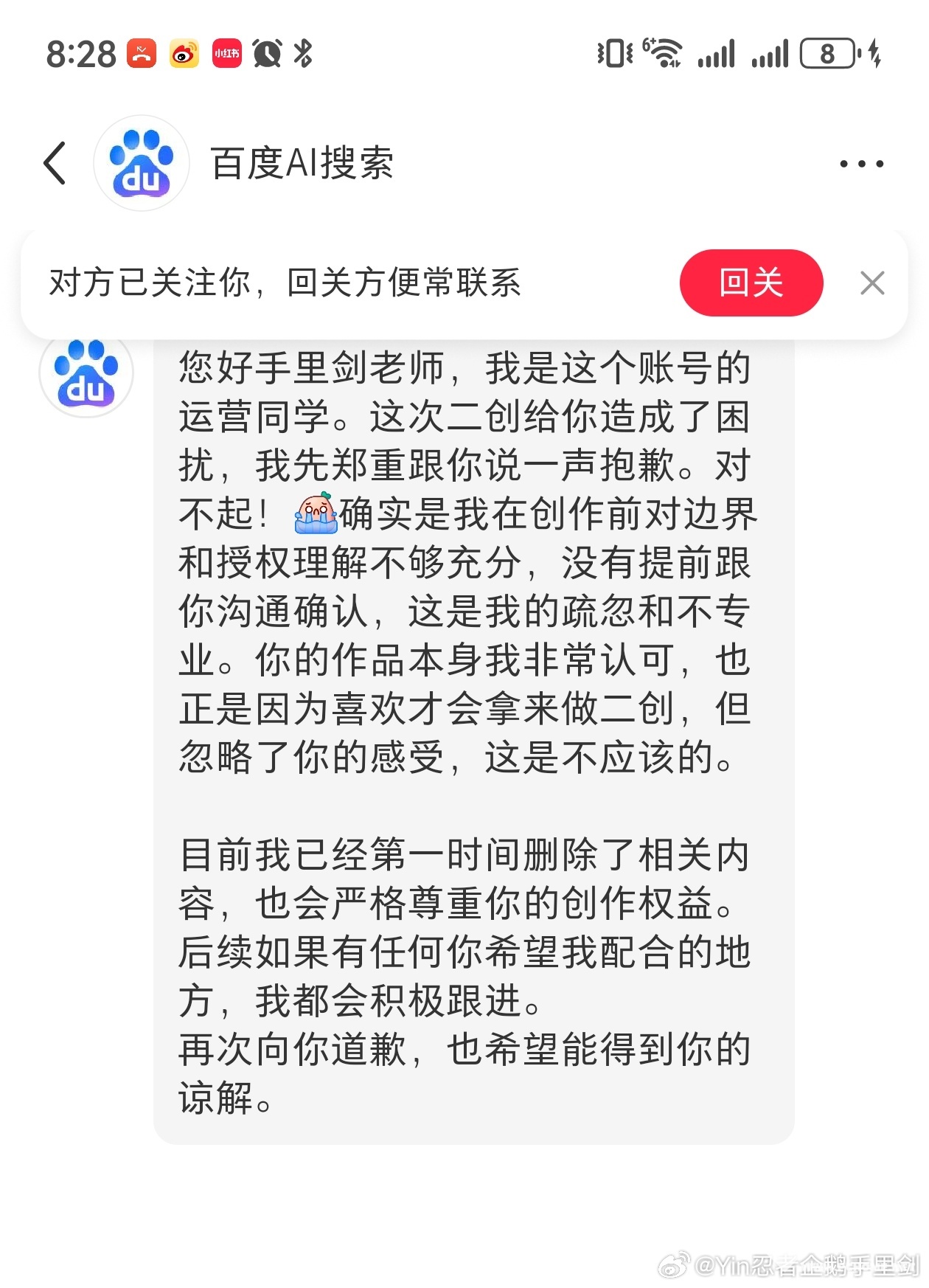 随后,“Yin忍者企鹅手里剑”晒出了一张百度AI搜索官微运营私信致歉的截图。该运营表示,“你的作品本身我非常认可,也正是因为喜欢才会拿来做二创,但忽略了你的感受,这是不应该的。”目前,百度AI搜索官微已删掉相关侵权内容。