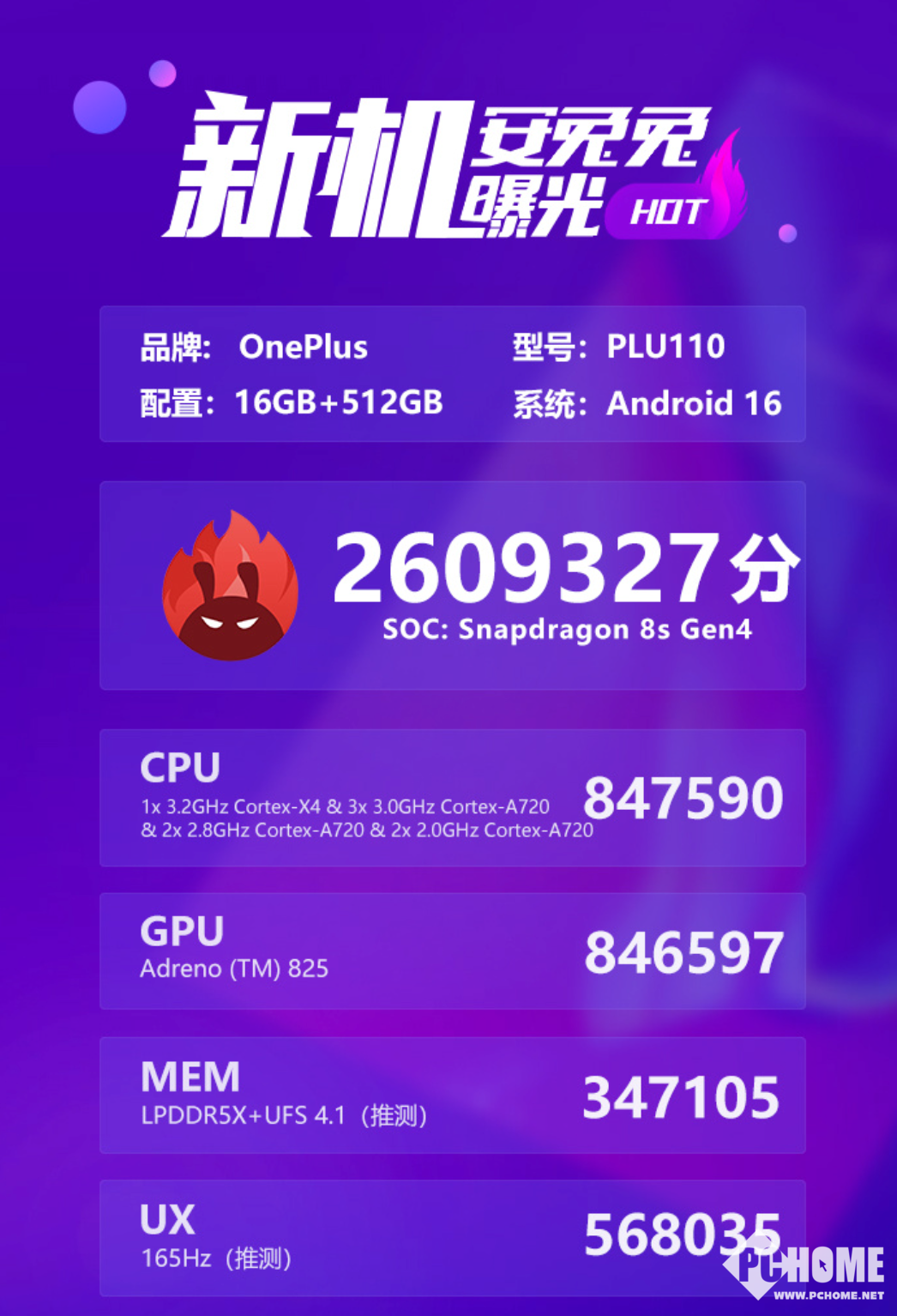 2025年12月23日,安兔兔官微爆料称,一加Turbo系列新机搭载高通骁龙8s Gen4移动平台,内置16GB内存以及512GB存储,安兔兔V11版跑分高达260万,放在Turbo档里是比较能打的存在。