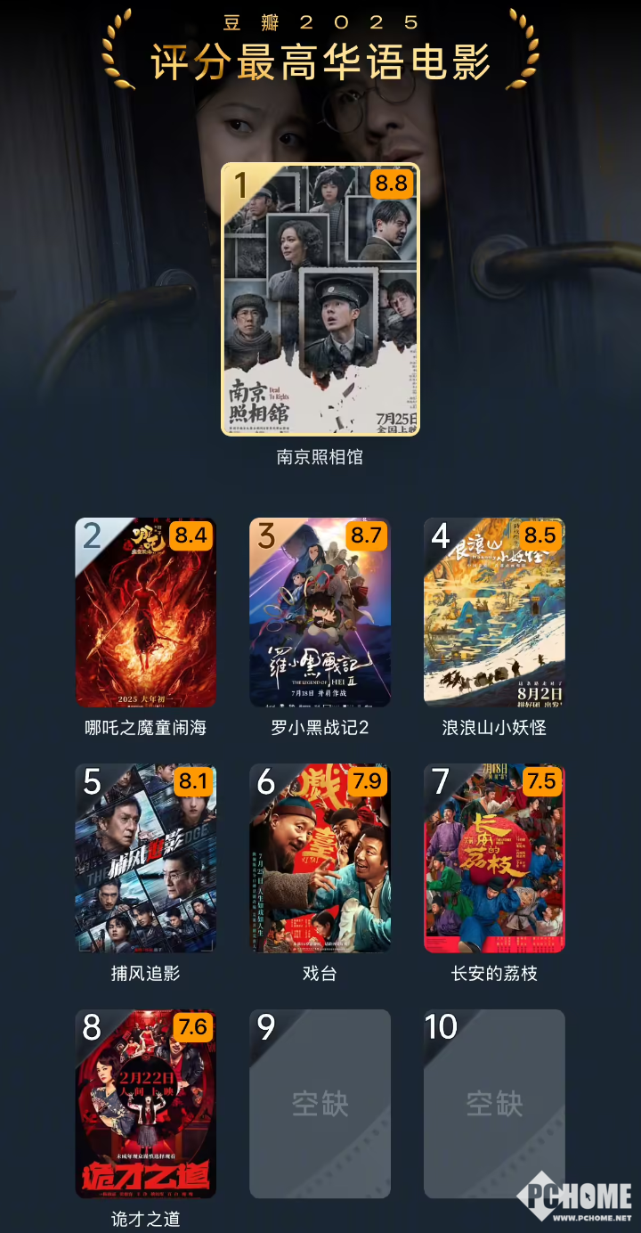 华语电影领域,《南京照相馆》以8.8分登顶,影片以照相馆为切口重构抗战历史叙事,凭借冷峻克制的镜头语言与扎实的叙事质量收获高口碑,成为纪念抗战胜利80周年的现象级作品。《哪吒之魔童闹海》以8.4分紧随其后,延续经典IP风格,视效升级的同时深化“与天地斗”的核心主题,跻身年度高分动画前列。