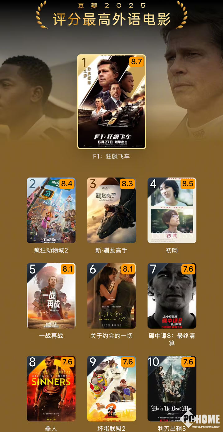 外语片方面,《F1:狂飙飞车》以8.7分夺冠,影片凭借实拍赛事镜头与剧情的无缝衔接打造极致视觉冲击,布莱德·皮特的精彩演绎圈粉无数。近期爆火的《疯狂动物城2》则以8.4分紧随其后。该榜单同时涵盖剧集、综艺等多个品类,完整呈现年度文化消费偏好,相关榜单已在豆瓣平台正式上线。