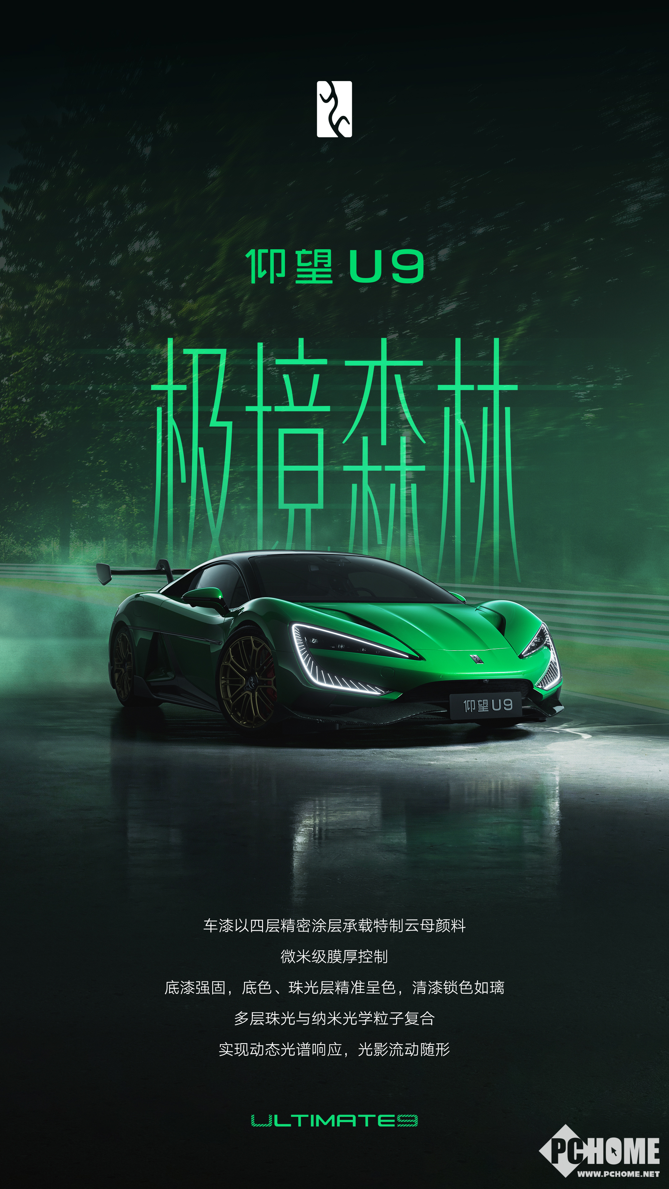 据官方介绍,“极境森林”车色灵感来源于仰望U9 Xtreme征服纽北“绿色地狱”的史诗级瞬间,静如深林,动似流光。车漆以四层精密涂层承载特制云母颜料、微米级膜厚控制,底漆强固,底色、珠光层精准呈色,多层珠光与纳米光学粒子复合,实现动态光谱响应,光影流动随形。官方定价外观配色5万元,内饰配色3万元。