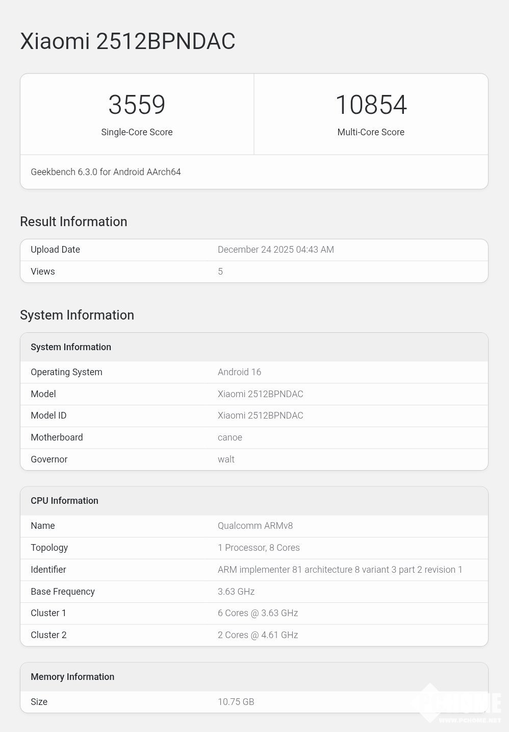 2025年12月24日,小米17 Ultra现身Geekbench,单核得分3559分,多核10854分,看齐小米17 Pro。