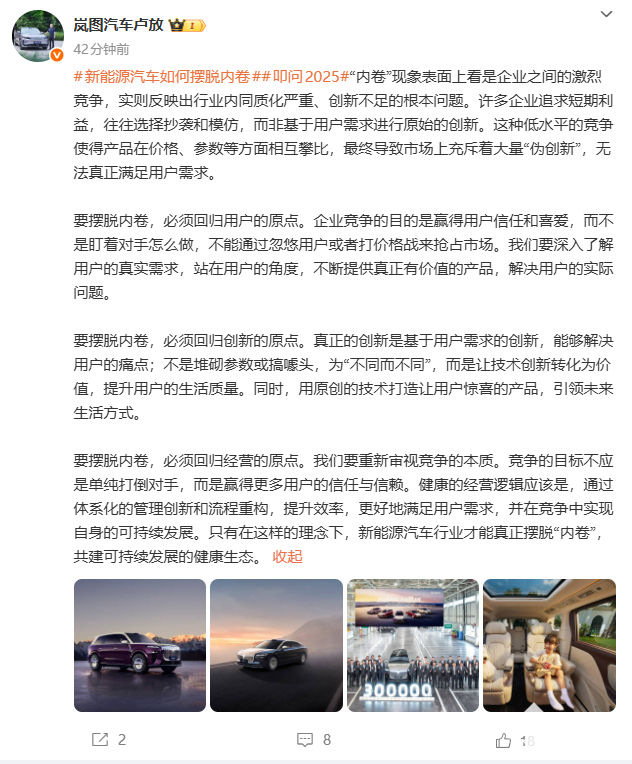2025年12月24日,岚图汽车科技股份有限公司董事长卢放在微博发长文谈新能源汽车如何摆脱内卷问题。