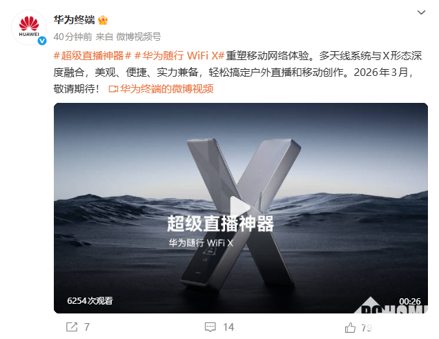 2025年12月24日,华为终端官方微博发布消息,华为随行WiFi X将于2026年3月发布。