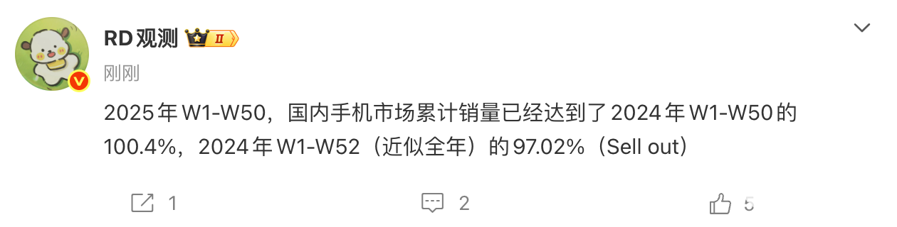 2025年12月25日,数码博主“RD观测”爆料称,2025年W1-W50(12月8日至12月14日),国内手机市场累计销量已经达到了2024年W1-W50的100.4%。