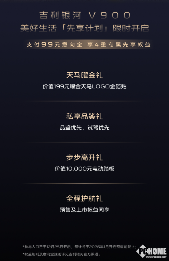 2025年12月25日,吉利银河官方微博宣布,吉利银河V900“先享计划”限时开启。