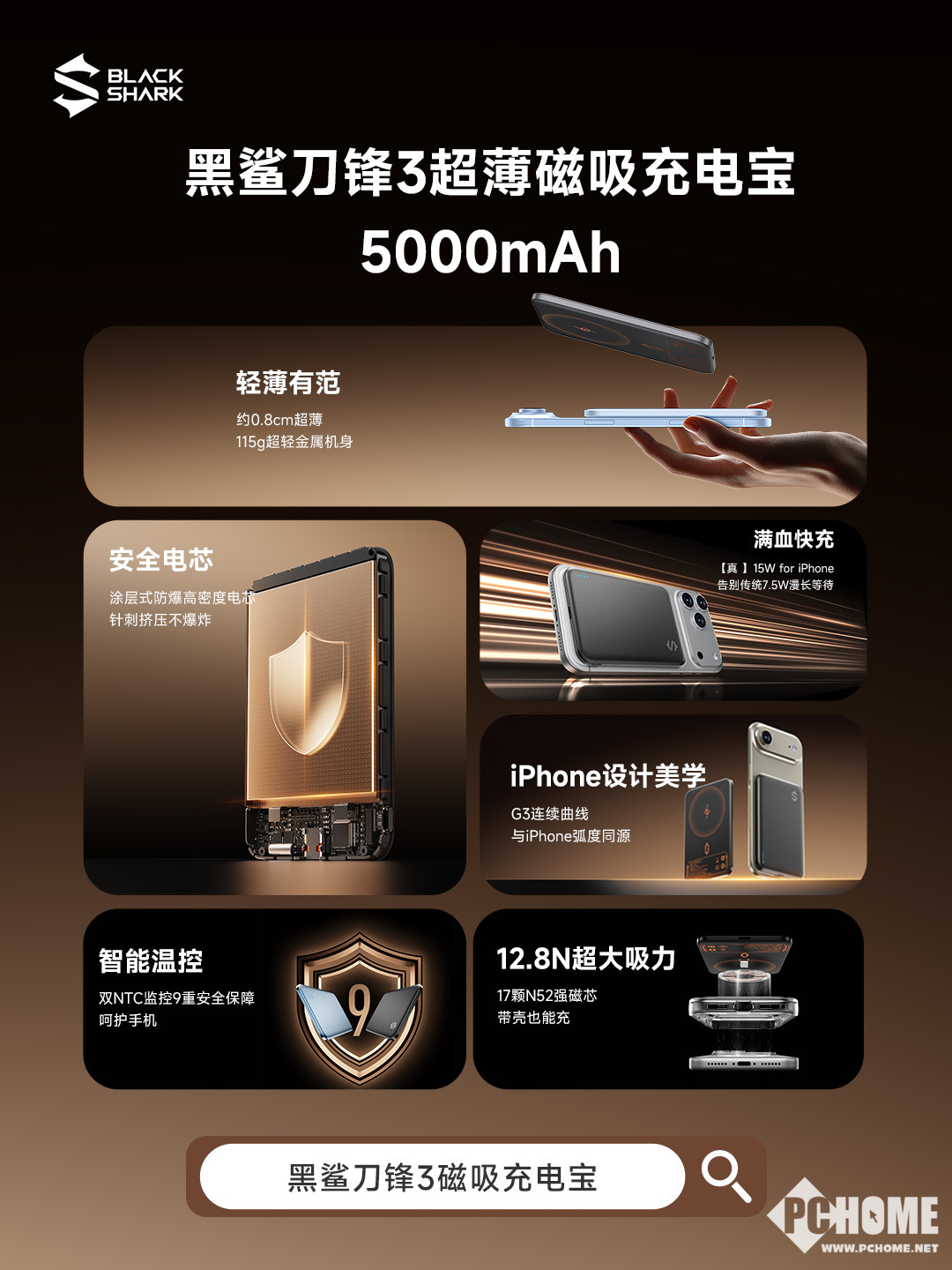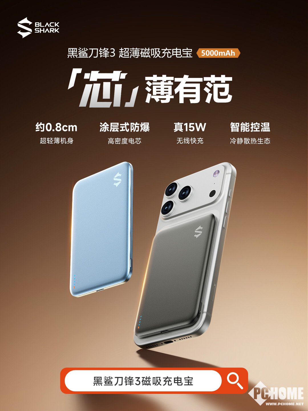 黑鲨刀锋3超薄磁吸充电宝现已开售,产品支持15W快充,双NTC监控智能控温,售价239元。