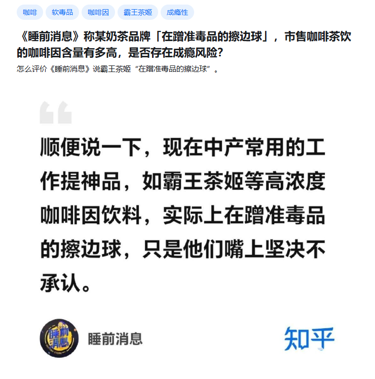 据了解,该话题由知乎博主睡前消息(B站:马督工)发起,该博主表示:现在中产常用的工作提神品,如霸王茶姬等高浓度咖啡因饮料,实际上是在蹭准毒品的擦边球,只是他们嘴上坚决不承认。此消息发出后得到了众多网友关注与讨论,其中,一位网友拿魔爪饮料举例,他称:毒品有明确定义,软毒品没有,只要和毒品具备类似性质的东西都可以算作,只是程度不同罢了,烟酒、槟榔等,本就是准毒品的擦边球。魔爪的咖啡因含量在30mg/100ml这个水平,与霸王茶姬不少款奶茶差不多,甚至还有不少奶茶比该含量还要高。