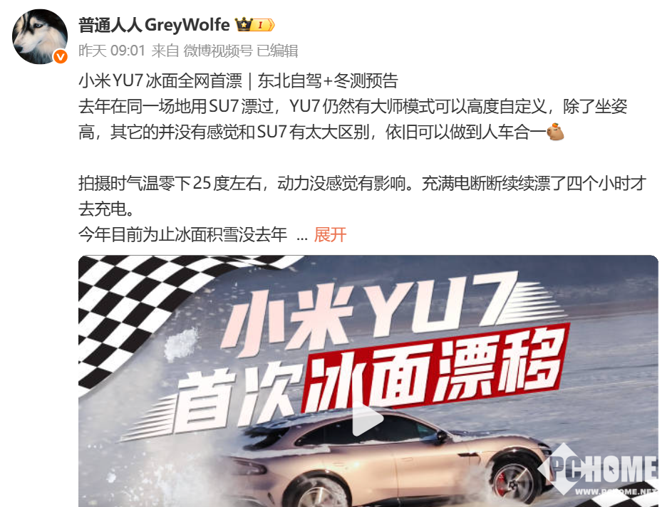 博主@普通人人GreyWolfe发布小米YU7冰面全网首漂测试视频,小米创办人雷军今日转发并强调安全第一。
