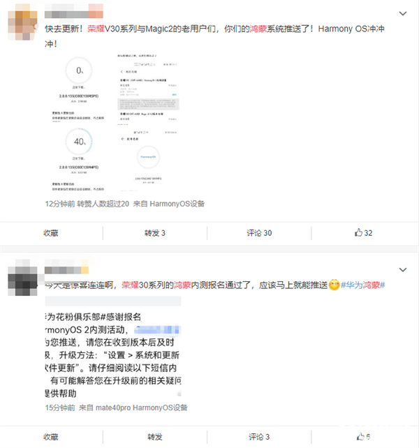 6月23日,HarmonyOS开启了第三批内测招募计划。今日,根据多名网友的反馈来看,荣耀V30系列等机型已经率先收到了HarmonyOS的系统推送。据悉,这次内测涵盖的机型包括:荣耀30系列、荣耀V30系列、荣耀20系列、荣耀V20系列、荣耀Magic 2、荣耀Play 4 Pro手机以及荣耀平板V6部分型号。