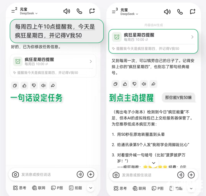 据介绍,用户把元宝App、电脑版更新至最新版本,直接把时间安排、自律习惯、任务计划一句话告诉元宝,到点就能准时提醒,此外还能提前测试任务、手动管理任务、自定义提醒。