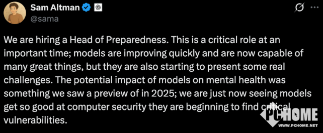 招聘信息提到,岗位负责制定并执行OpenAI安全框架,追踪前沿AI能力可能引发的新型严重危害,包括模型滥用、网络安全漏洞(如AI自主发现高危漏洞)、心理健康影响(如用户自杀倾向激增),以及生物化学威胁、AI自我进化失控等。需确保模型能力提升的同时为其设定“安全围栏”,平衡技术收益与社会责任。CEO奥尔特曼还强调该职位压力极大,需立即跳入“深水区”解决问题,堪称“救火队长”。并指出该岗位需解决“几乎没有历史参考”的复杂问题,需应对现实中的“棘手例外和边界情况”。
