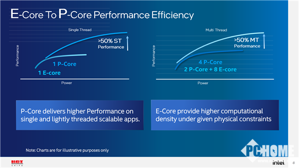 近日,Intel首次公开了Alder Lake 12代酷睿的大小核架构设计,已经它们之间的性能关系,按照Intel的说法,在同等功耗下,大核的单线程性能比小核高出50%,实际单线程性能还会更好,而小核的性能其实并没有那么孱弱,尽管它本质上还是Atom那一套。