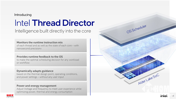 Thread Director会实时监测每个线程的指令集、每个核心的状态,时间间隔在纳秒级别,然后反馈给操作系统的调度器,便于后者针对工作负载做出最优化分派。
