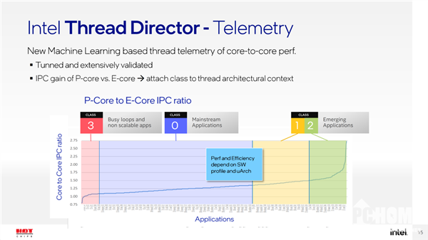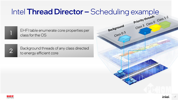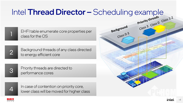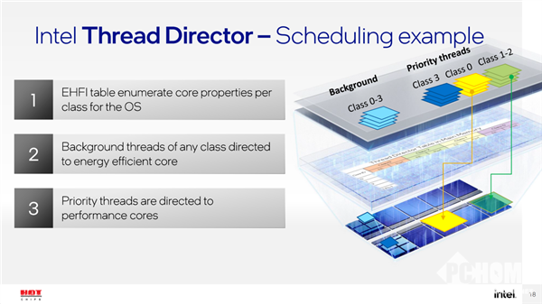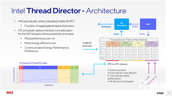 再深入一点来说,Thread Director在监控线程、核心状态的时候,会用到机器学习算法,在硬件层面定期写入、刷新一个反馈表(EHFI),操作系统调度器就以此为准去安排。