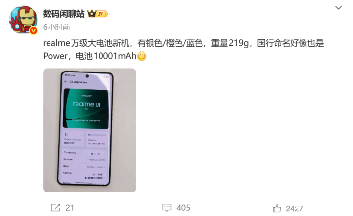 12月29日,知名数码博主“数码闲聊站”爆料称,真我一款主打超长续航的新机浮出水面,该机内置10001mAh超大容量电池,国行版本或命名为“Power”。