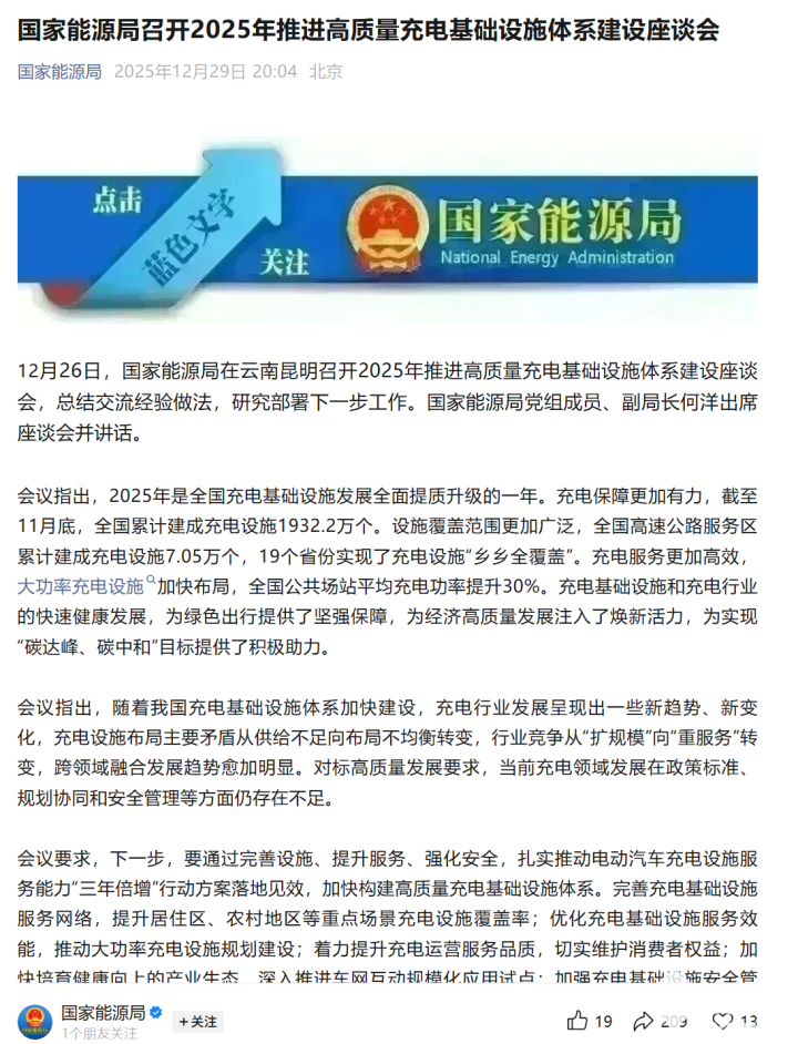 据悉,该数据来自国家能源局近日在云南昆明召开的2025年推进高质量充电基础设施体系建设座谈会。会议指出,2025年是全国充电基础设施发展全面提质升级的一年,全国高速公路服务区累计建成充电设施7.05万个,高速充电网络覆盖持续完善,为新能源汽车长途出行提供坚实保障。