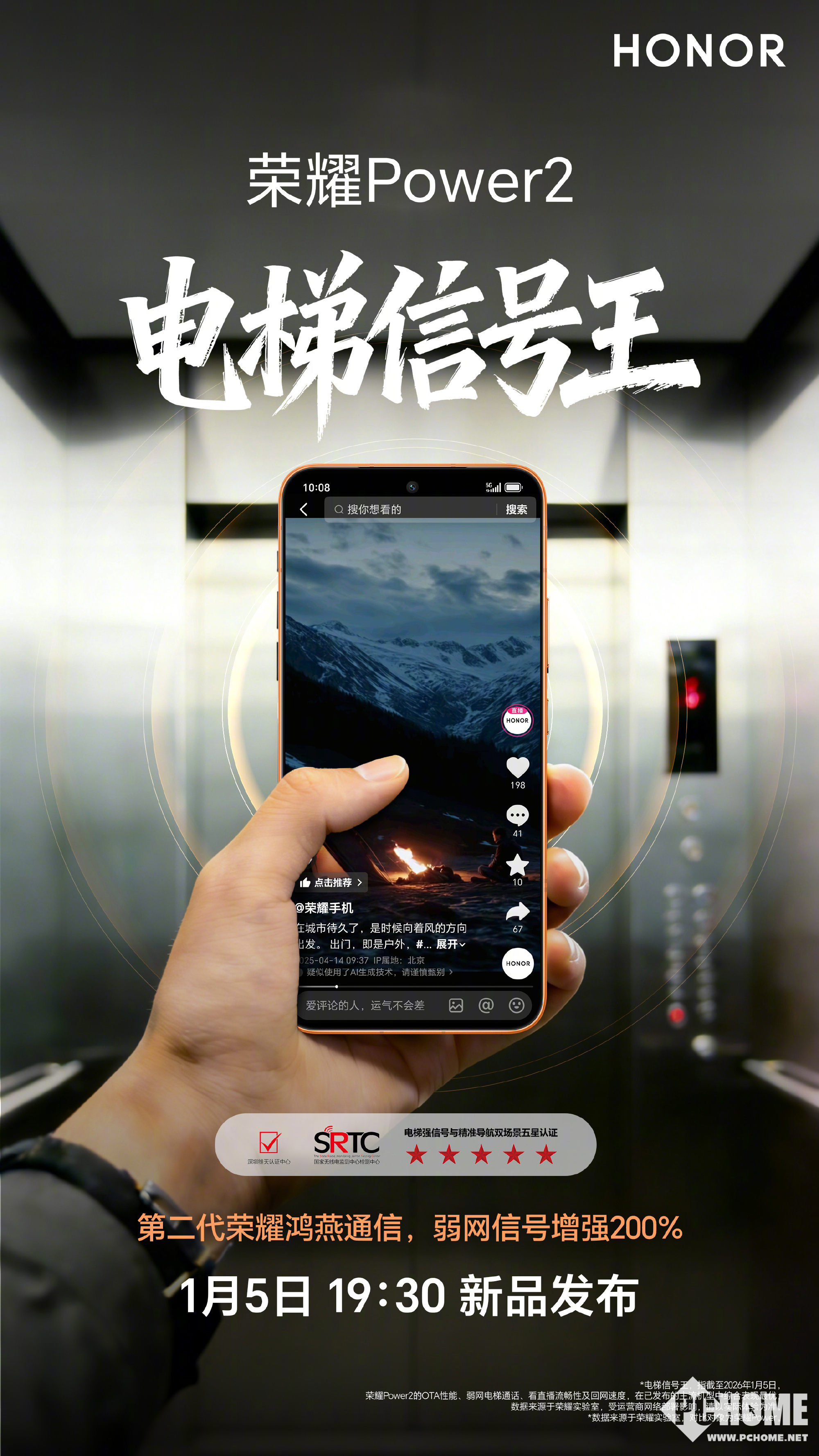 2025年12月30日,荣耀官方微博发布消息,荣耀Power2搭载第二代鸿燕通信,行业顶配天线规格,弱网信号增强200%,号称“电梯信号王”。