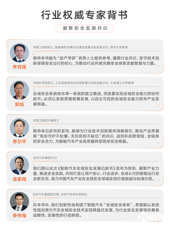 据了解,《智能汽车全域安全发展白皮书》由吉利汽车联合中国汽车技术研究中心、清华大学等11家产学研机构于2025年12月12日共同发布。同时,首次定义了“全域安全2.0”体系,在传统被动安全基础上,新增了“公域安全”维度,覆盖驾驶安全、主动安全、被动安全、救援安全、健康安全、新能源安全、防盗安全、数字安全九大系统,将安全范畴从单车防护扩展至交通生态整体安全,并且关注社会交通参与者安全,推动车路协同、应急救援联动等公共安全技术标准化。